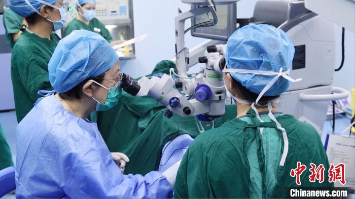 黎曉新總院長(zhǎng)為西藏區(qū)醫(yī)生開展手術(shù)帶教?!B門眼科中心供圖