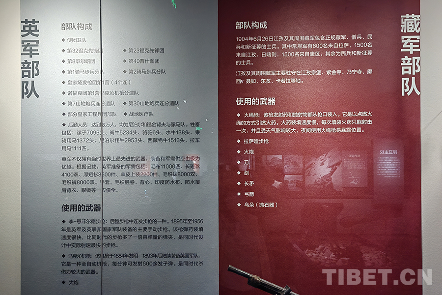 圖為宗山號(hào)角——紀(jì)念西藏江孜抗英保衛(wèi)戰(zhàn)120周年主題展,對(duì)比英帝國(guó)主義侵略者與當(dāng)時(shí)江孜守軍軍力情況的展板 攝影:楊月云