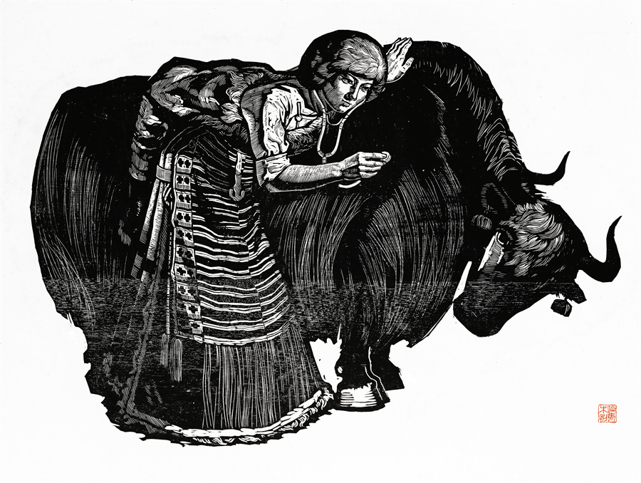 圖為羅倫張作品《草原巡醫(yī)》 (木版畫 1979年)