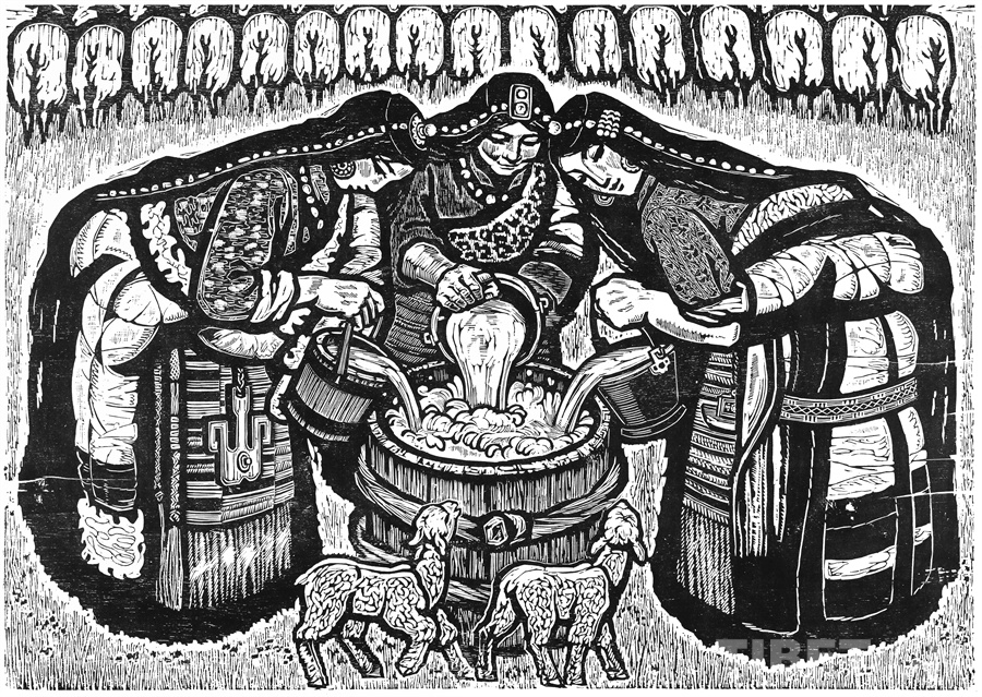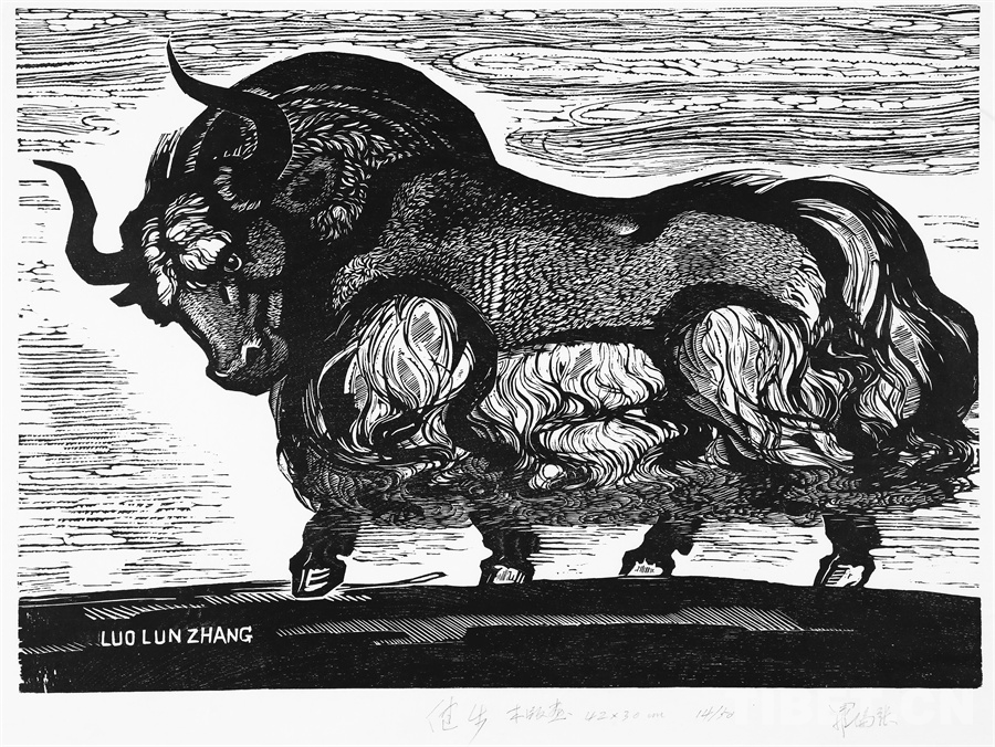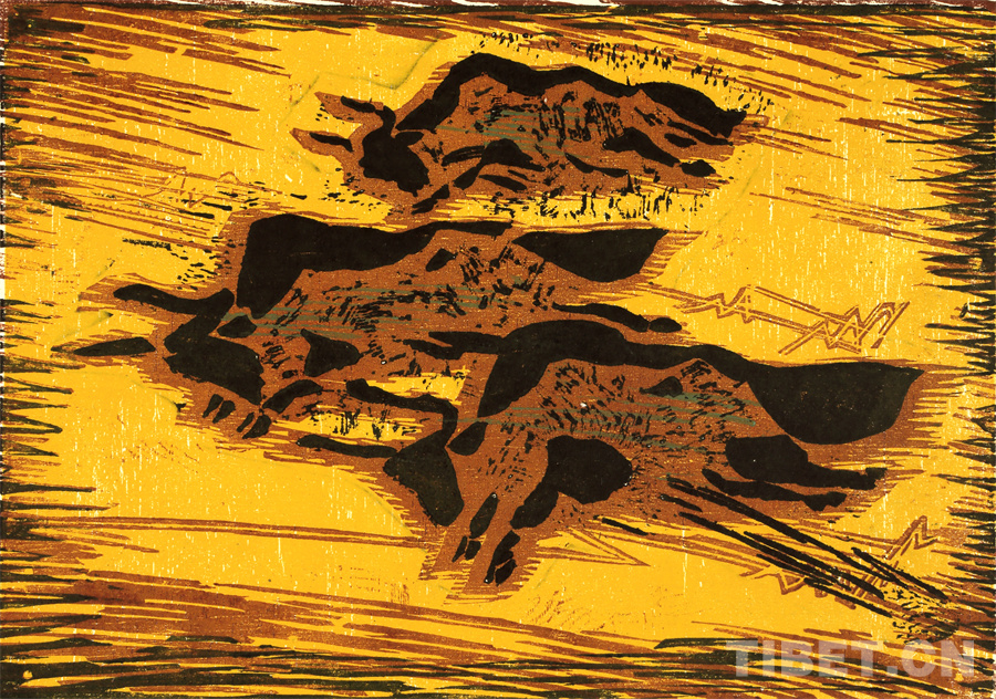 如果非要說我在版畫技法上有什么創(chuàng)新,參照西藏匠人刻經(jīng)文,在石頭上刻出來然后印出來也許就算。這不是一般石版畫概念,那叫石印,平版印刷;我這是凹版印刷??唐饋砗苜M(fèi)勁,我也不管費(fèi)不費(fèi)勁。我有一批這樣的石刻作品。綜合版作品手法較多,我通常分別在石板和木板上刻,然后套起來印。如果搞學(xué)術(shù)交流,也許值得一談。至于說到創(chuàng)新,第一我不認(rèn)為我有什么創(chuàng)新,第二我不認(rèn)為在藝術(shù)上、在美術(shù)上能夠輕易談創(chuàng)新這個(gè)詞。還有第三個(gè)觀點(diǎn):不需要?jiǎng)?chuàng)新。很簡單,你先把傳統(tǒng)學(xué)到手再說。既是傳統(tǒng),就有它的存在理由,否則早就夭折了,還傳什么統(tǒng)呢?傳,而且統(tǒng)?。〗y(tǒng)是什么意思?基調(diào)是它統(tǒng)一起來的。先把傳統(tǒng)學(xué)到手,爐火純青了,神來之筆出現(xiàn)了,才有可能有所創(chuàng)造?;A(chǔ)是重要的。