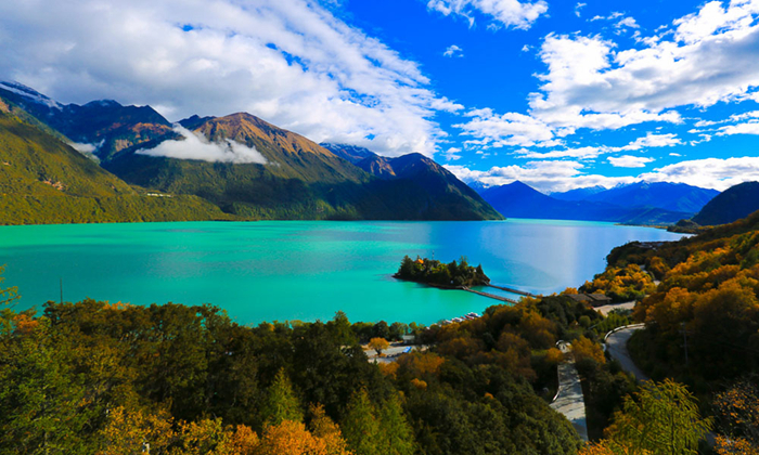 海拔較高的巴松措,秋日來的晚了一些,但秋日的痕跡已爬上樹梢。