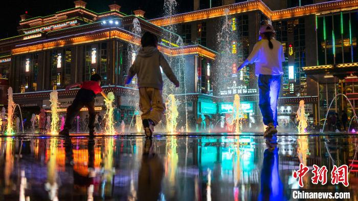 圖為孩子們?cè)诓际胁桉R廣場(chǎng)噴泉附近玩耍。江飛波 攝