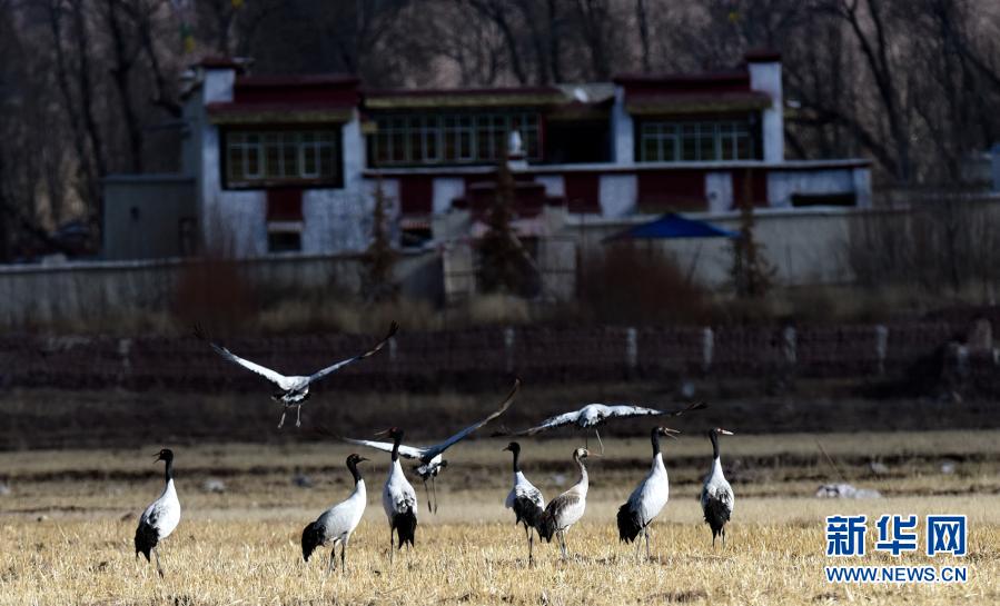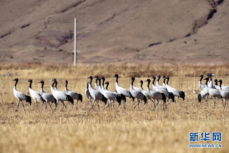 林周縣黑頸鶴自然保護(hù)區(qū)里的黑頸鶴(12月12日攝)。新華社記者 張汝鋒 攝