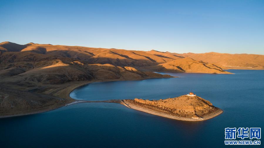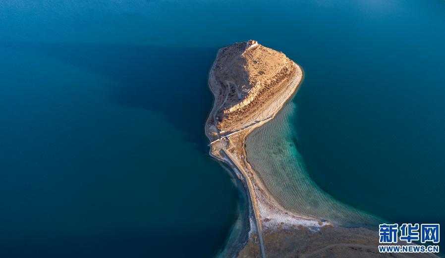 坐落于羊湖北岸一座小島上的日托寺(無人機照片,1月10日攝)。新華社記者 孫非 攝