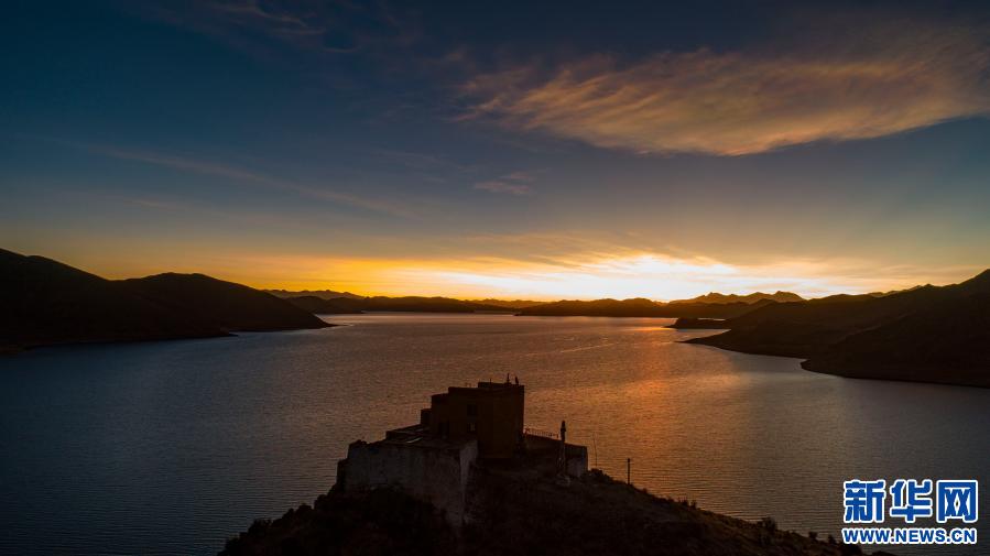 落日余暉下,日托寺的影子倒映在羊湖湖面(無人機照片,1月9日攝)。新華社記者 孫非 攝