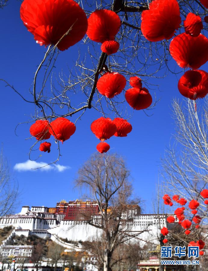 2月8日拍攝的布達(dá)拉宮前迎接春節(jié)和藏歷新年的吉祥裝飾。新華社記者 覺(jué)果 攝
