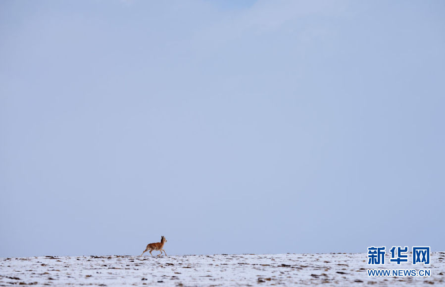 4月20日,一只藏羚羊向卓乃湖方向行進(jìn)。新華社記者 費(fèi)茂華 攝