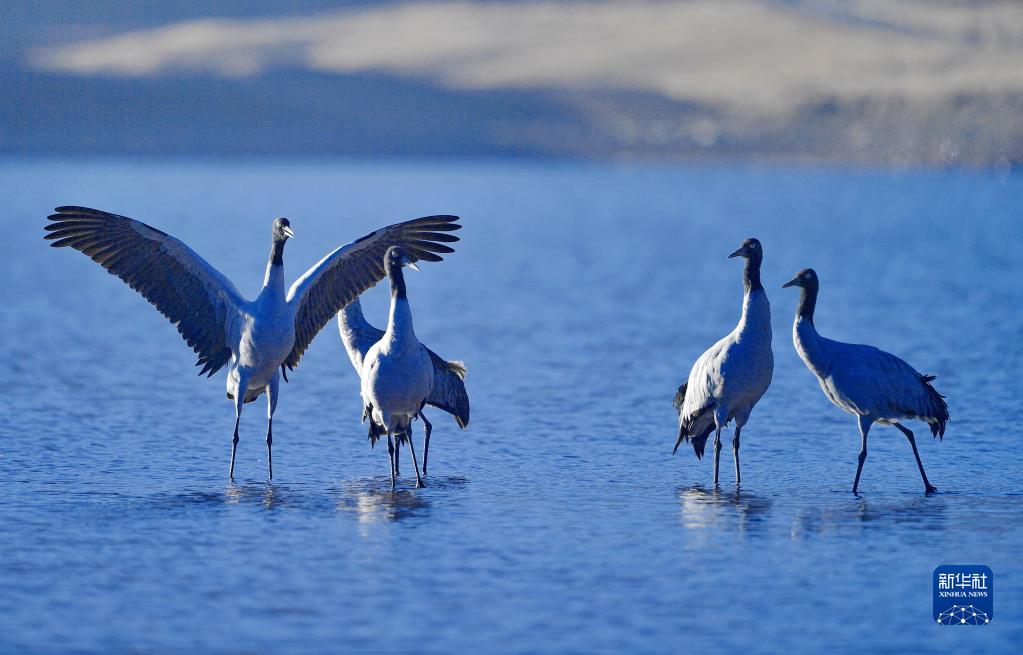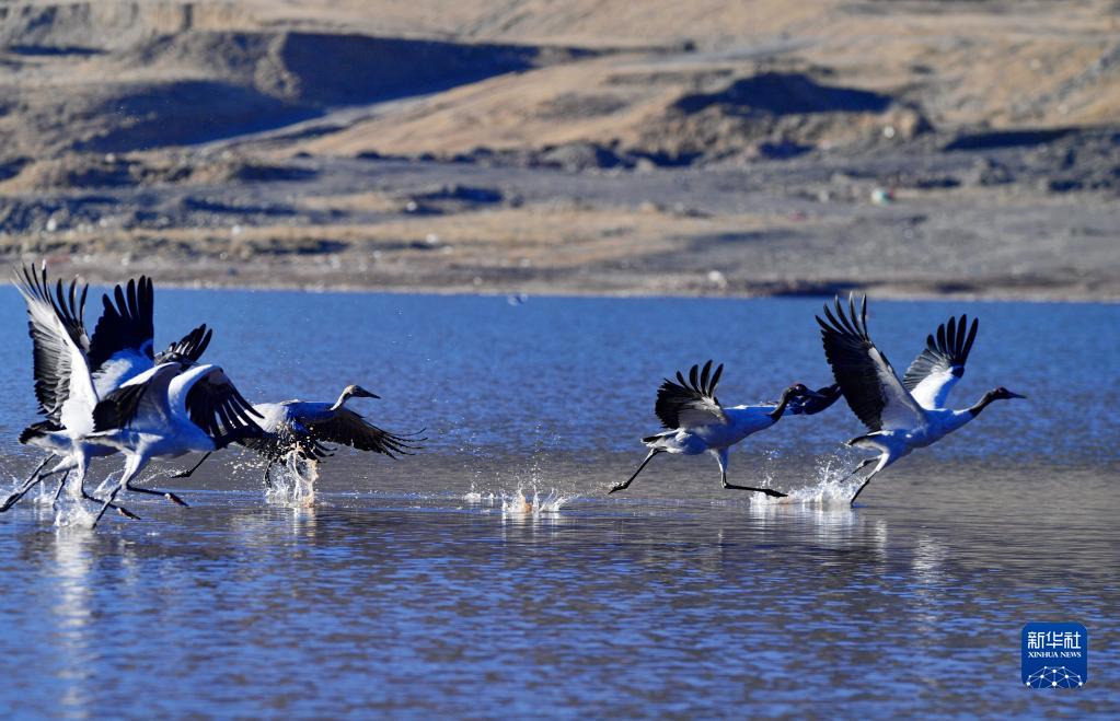 這是在林周縣虎頭山水庫拍攝的黑頸鶴(12月7日攝)。新華社記者 張汝鋒 攝