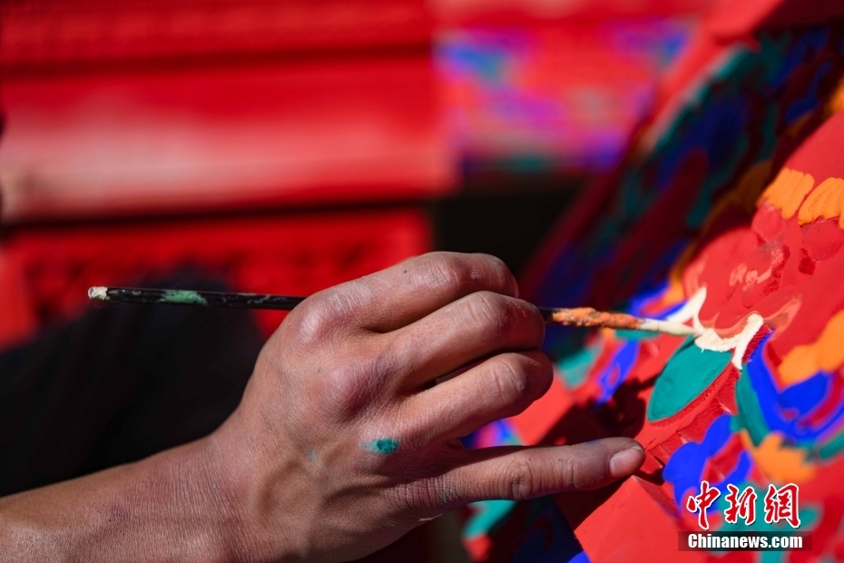 12月28日,西藏拉薩堆龍德慶區(qū),古俗民族傳統(tǒng)手工藝發(fā)展專業(yè)合作社員工在房屋上繪制藏式裝飾。據(jù)悉,該合作社以繪畫、木工、縫紉為主,承接傳統(tǒng)手工藝方式制作家具、房子裝修、唐卡繪畫、旅游產(chǎn)品、文物建筑維修等工作。自2018年合作社成立至今,帶動(dòng)就業(yè)共60余人。 中新社記者 貢嘎來松 攝