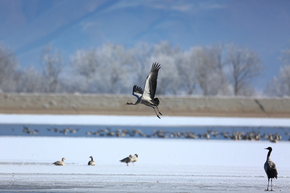黑頸鶴是國家一級保護(hù)動物。近年來,隨著當(dāng)?shù)厣鷳B(tài)保護(hù)力度越來越大,每年11月前后至次年3月底,來林周縣越冬的候鳥越來越多。為保護(hù)黑頸鶴,林周縣出臺系列措施,專門設(shè)立多個(gè)定期投食點(diǎn),安排專人投撒青稞、小麥等黑頸鶴所需食物;成立巡護(hù)隊(duì),嚴(yán)格實(shí)行24小時(shí)巡護(hù)制度。