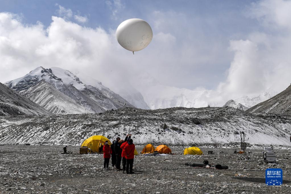在珠峰登山大本營,科研人員放飛無線電探空氣球(4月30日攝)。新華社記者 姜帆 攝