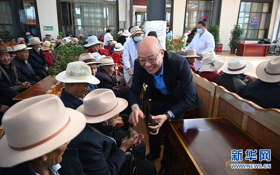 6月3日,西藏山南市集中供養(yǎng)服務(wù)中心內(nèi),老人向安徽第七批援藏工作隊(duì)的隊(duì)員獻(xiàn)上潔白的哈達(dá)。新華網(wǎng) 王雷 攝