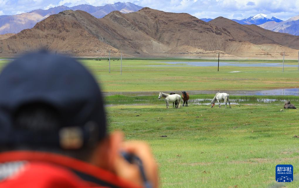 游客拍攝班公湖畔的駿馬(7月28日攝)。新華社記者 關明輝 攝