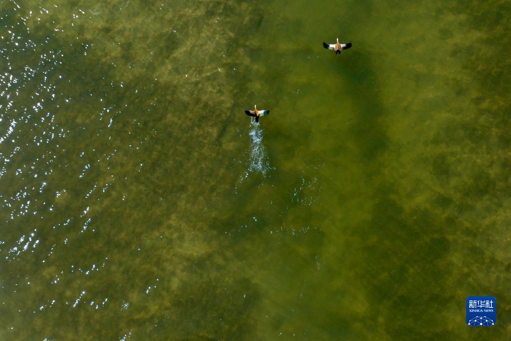 飛鳥從打加錯湖面掠過(無人機照片,8月30日攝)。新華社發(fā)(旦增努布 攝)