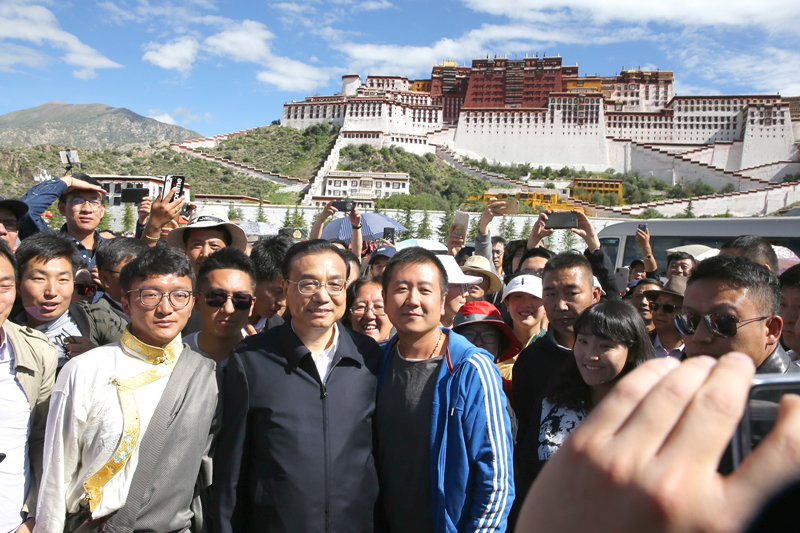 7月27日,考察布達(dá)拉宮文物保護(hù)之后,李克強(qiáng)總理來到布達(dá)拉宮廣場(chǎng)??吹娇偫淼絹?,廣場(chǎng)上的市民與游客潮涌而來,爭(zhēng)相與總理握手。李克強(qiáng)說,從你們的笑容中和精神面貌上我能感受到這里的氣氛祥和安寧,衷心祝愿大家生活安康,扎西德勒!有游客高聲喊,“總理能不能和我們一起照張相?”李克強(qiáng)欣然應(yīng)允。市民游客們紛紛拿出各自的手機(jī),有的自拍,有的交換手機(jī)相互幫著拍,密集的拍攝聲此起彼伏。