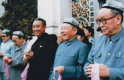 圖為習(xí)仲勛(左一)、十世班禪(中)、鄧穎超(右一)、參加中國藏語系高級佛學(xué)院成立大會。圖片來源:人民日報