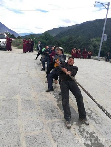 開展拔河比賽活動。由統(tǒng)戰(zhàn)民宗、工商聯(lián)干部、寺廟僧尼、珠曲登村村民、簡切村村民分別組成4支參賽隊伍,他們揮灑著汗水,在隊員們的加油鼓勁聲中賽出了力量,賽出了精神。
