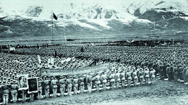 圖為修建進藏公路的部隊進行動員大會。圖片來源:人民網(wǎng)