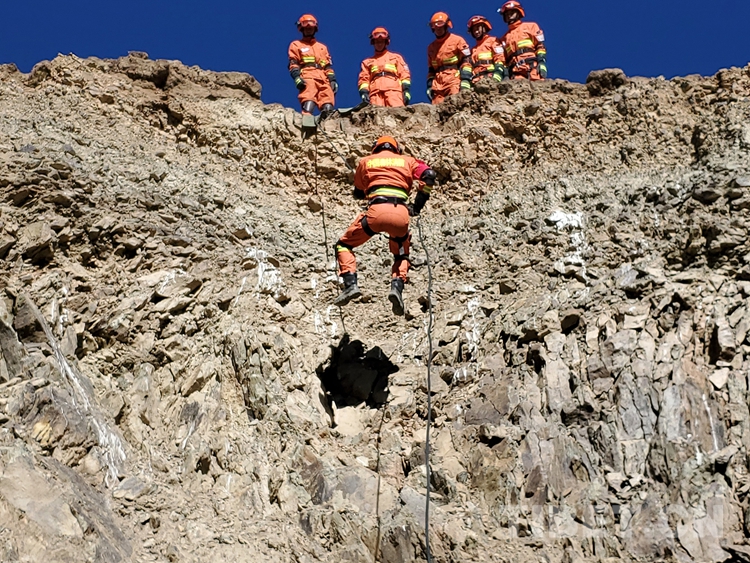 圖為復(fù)雜地形下降訓(xùn)練,進一步提高隊員應(yīng)對各種環(huán)境中繩索救援技術(shù)的綜合運用能力