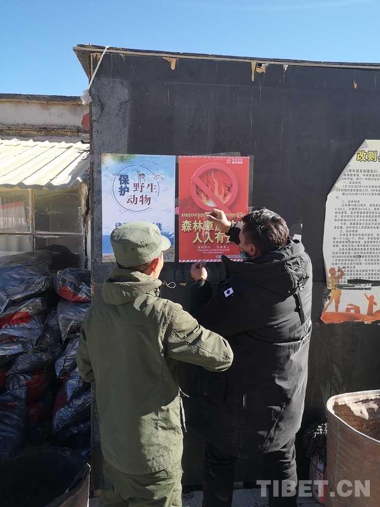 圖為改則縣林業(yè)和草原局巡護(hù)人員粘貼宣傳海報
