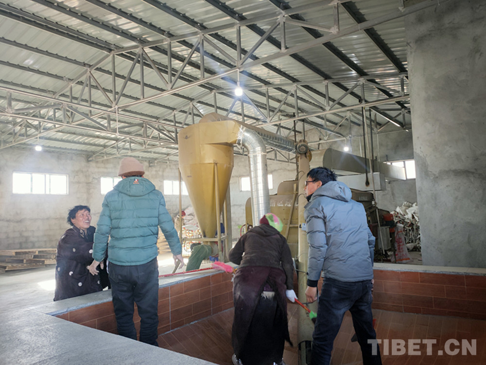 圖為甘孜縣青稞文化園的工人們正在將收購的青稞倒入精選機(jī)