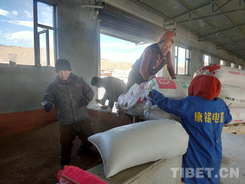 在該園的格薩甲波糧倉現(xiàn)場,裝滿糧食的拖拉機(jī)和貨車,有的忙著把青稞卸下來,有的忙著把青稞倒進(jìn)糧食精選機(jī)里、有的忙著稱重、有的忙著做登記,忙得不可開交。
