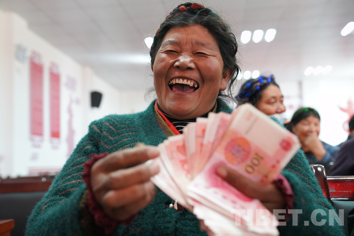 令人激動(dòng)的時(shí)刻來(lái)臨了?!岸M索朗曲珍,分紅26739元;二組支張,分紅6495元;一組朗杰曲珍,分紅2668元……”社員們?nèi)讲⒆鲀刹?,滿臉喜滋滋地依次上臺(tái)接過(guò)沉甸甸的分紅。他們?cè)诜旨t發(fā)放清單上填上名字,摁上手印后,喜笑顏開(kāi)地?cái)?shù)著手里的錢。