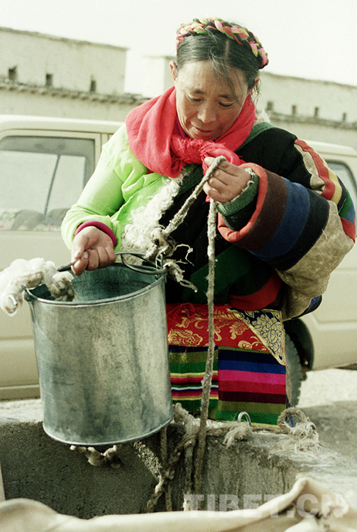 圖為文部辦事處申亞鄉(xiāng)女鄉(xiāng)長卓瑪在打井水。她當(dāng)時(shí)是全國“三八”紅旗手、那曲地區(qū)唯一的女鄉(xiāng)長(唐召明1989年12月攝)