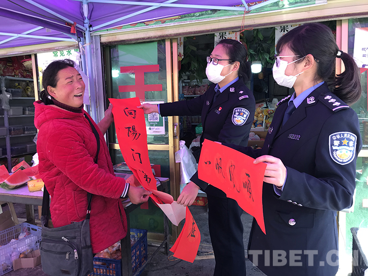 2月7日,拉薩邊檢站邀請拉薩市文聯(lián)書法家協(xié)會共同開展“同心同書——祖國新春好”送萬福進萬家活動。4名書法家揮毫潑墨,書寫漢文藏文春聯(lián),散發(fā)著墨香的春聯(lián)凝聚著無限的祝福。隨后,邊檢站格?;ㄅ訄?zhí)勤隊民警為駐地商戶送“?!彼痛郝?lián)。在駐地的一家超市,商戶張大姐興高采烈地與民警一邊貼春聯(lián),一邊笑著說:“感謝你們送來的新春祝福。今年雖然沒能回家過年,但有你們的陪伴照顧,我們感到很開心?!?/p>