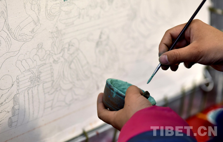 中國西藏網(wǎng)訊 加熱顏料,拿筆蘸取,細(xì)心上色……眼前的這幅《宗喀巴大師》唐卡,尼瑪倉拉和同伴已共同繪制了三個多月,正到了上色的關(guān)鍵步驟,不容一絲紕漏。