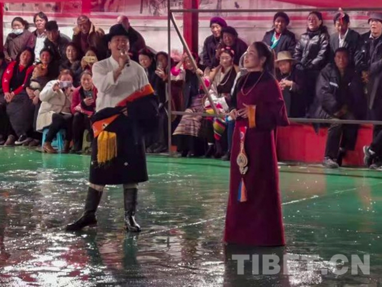 演出活動在服飾表演《幸福的日子》中拉開序幕。安麥西組的農(nóng)牧民群眾身著節(jié)慶盛裝走上舞臺,精彩的服飾走秀展示了當?shù)孛褡逄厣?;歌曲《弦舞芒康》《心中紅》引得群眾情不自禁地和唱,動人的歌詞句句唱進了觀眾的心坎里;群眾自導自演的小品《活捉鬼子》在逗得大家捧腹大笑之余,讓大家明白當前和平生活的來自不易;舞臺劇《四個老頭贊美新時代》及村民帶來的原生態(tài)弦子歌舞《嘎哇啦》演唱出了贊美幸福新生活、感恩共產(chǎn)黨的美好心聲,展示了產(chǎn)生發(fā)展于生產(chǎn)生活中的弦子文化……一場場豐富精彩的表演節(jié)目點燃了圍坐廣場四周的觀眾的熱情。
