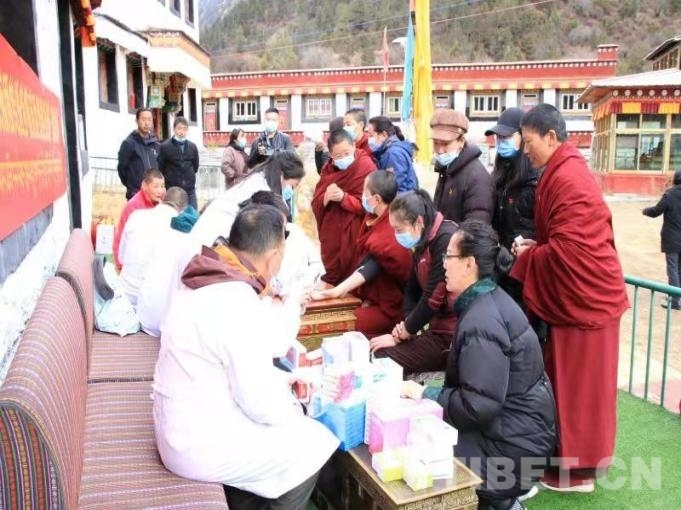 在古覺拉康,醫(yī)務(wù)人員為寺廟僧尼測血壓、診脈、健康咨詢、健康知識宣講,免費發(fā)放常用西藥、藏藥20余種及糖尿病、高血壓、肺結(jié)核等慢性疾病與新冠肺炎疫情防控宣傳資料;細致講解常見病、多發(fā)病的預(yù)防知識;針對不同病癥和個體差異提出合理的診療建議和治療方案。同時,還為僧尼發(fā)放了毛巾、牙膏、洗潔精等衛(wèi)生用品。