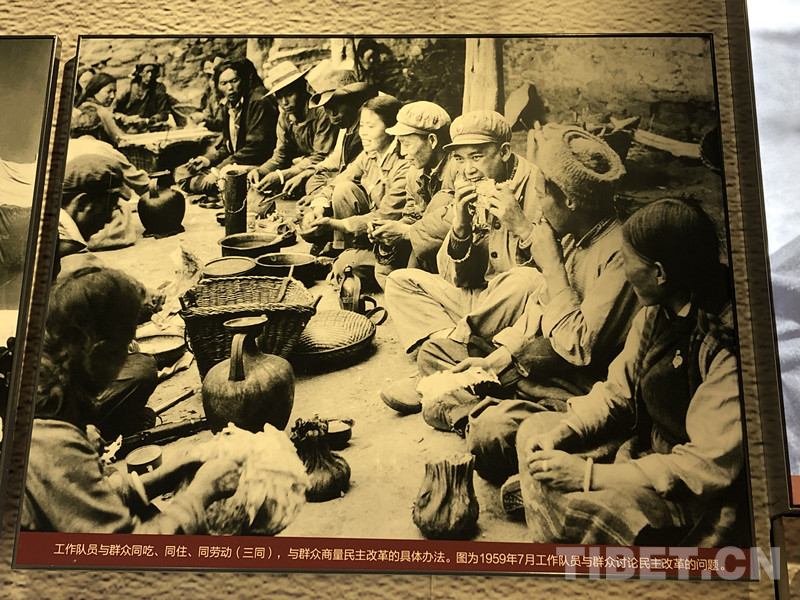 圖為西藏民主改革時工作隊(duì)員與群眾同吃、同住、同勞動。圖片源自拉薩烈士紀(jì)念館