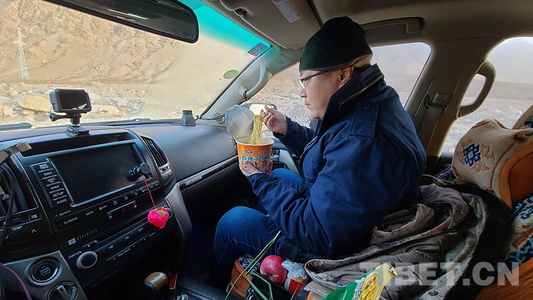 圖為呂智勇自駕向阿里普蘭運送防疫物資期間,在車?yán)锍苑奖忝?/p>