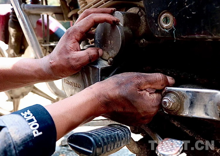 如果你經(jīng)過(guò)日喀則邊境管理支隊(duì)陳塘邊境派出所頓樟執(zhí)勤點(diǎn),你有可能會(huì)在執(zhí)勤點(diǎn)旁邊的空地上看見(jiàn)一位不停揮舞著扳手,雙手沾滿(mǎn)機(jī)油的民警正圍著摩托車(chē)忙碌著。他叫王昱隆,是陳塘邊境派出所的一名民警,年初被分配到頓樟執(zhí)勤點(diǎn),到現(xiàn)在他已經(jīng)義務(wù)幫助不少地過(guò)往行人維修摩托車(chē)了。