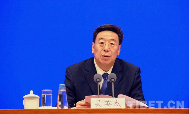 圖為中共西藏自治區(qū)委員會(huì)書記吳英杰在發(fā)布會(huì)上介紹西藏發(fā)展情況 攝影:劉莉