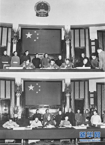 圖為1951年5月23日,中華人民共和國中央人民政府全權代表(上圖)和西藏地方政府全權代表(下圖)在《中央人民政府和西藏地方政府關于和平解放西藏辦法的協(xié)議》上簽字。上圖坐者右起為中央政府全權代表:李維漢、張經(jīng)武、張國華、孫志遠。下圖坐者右起為西藏地方政府全權代表:阿沛?阿旺晉美、凱墨?索安旺堆、土丹旦達、土登列門、桑頗?登增頓珠。