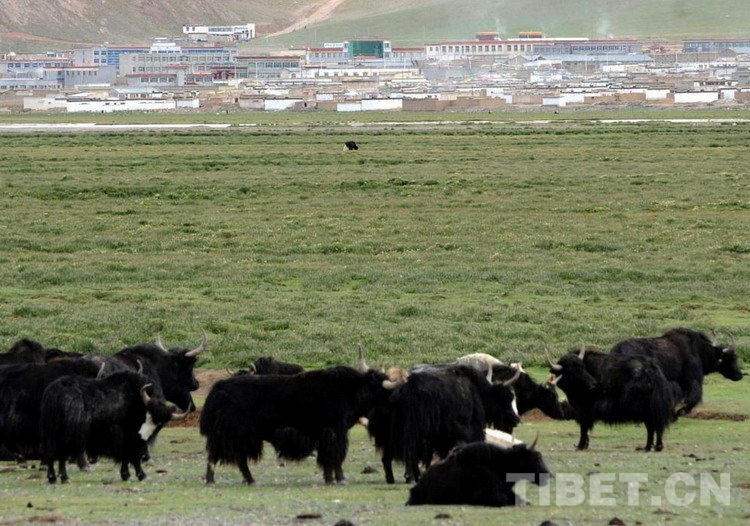 這是遠(yuǎn)眺申扎縣城新貌,前景是放牧的牛群(唐召明2009年攝)