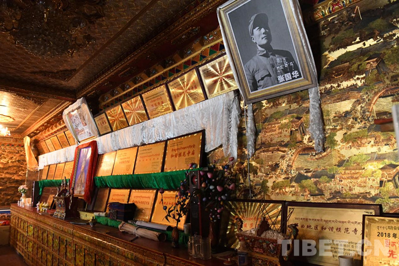 圖為寺廟懸掛著西藏自治區(qū)級(jí)、市級(jí)、縣級(jí)和諧模范寺廟、愛(ài)國(guó)愛(ài)教寺廟等榮譽(yù)獎(jiǎng)牌,以及前西藏軍區(qū)司令員、十八軍軍長(zhǎng)張國(guó)華的照片 攝影:索南多杰