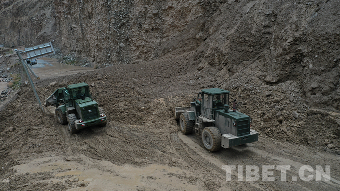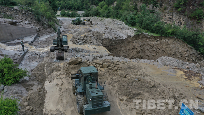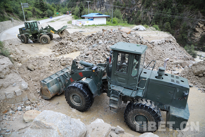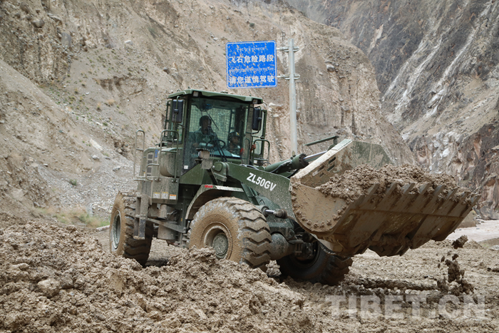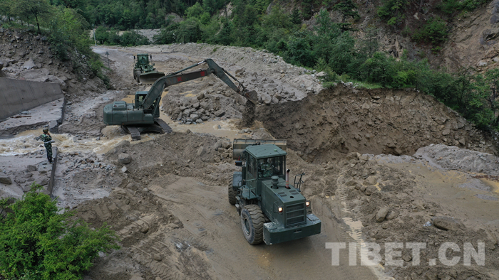 圖為該支隊救援官兵正在對川藏線玉普鄉(xiāng)境內(nèi)泥石流進(jìn)行清理