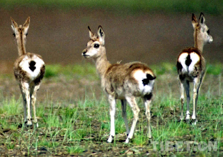 藏原羚(俗稱黃羊),元月份是交配期,當(dāng)年7月份是產(chǎn)羔期。它們個(gè)子不高,小巧而靈活,最明顯的標(biāo)志是屁股上有塊心形的白色印記,黑色的小尾巴搭在白屁股上,跑起來一甩一甩的,樣子十分可愛。它們少則三五只,多則幾十只甚至上百只一起活動(dòng)。這種動(dòng)物在藏北草原最為常見。