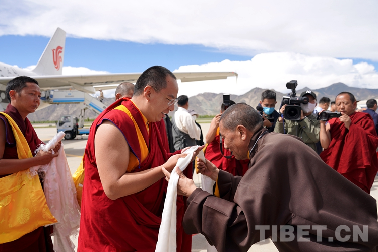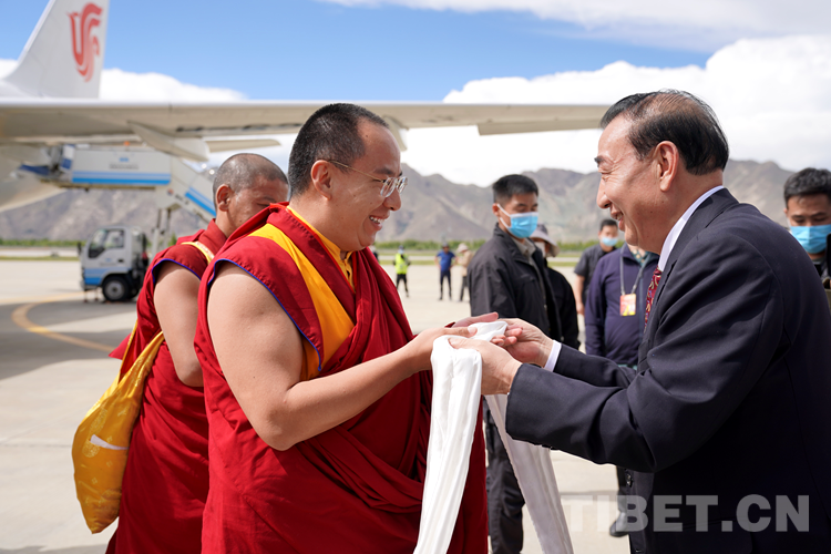西藏自治區(qū)黨委常委、統(tǒng)戰(zhàn)部部長,區(qū)政協(xié)黨組副書記、副主席旦科等西藏自治區(qū)相關(guān)領(lǐng)導(dǎo)在貢嘎機(jī)場迎接,互敬哈達(dá)。