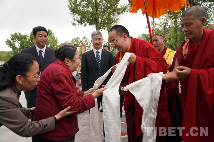 圖為西藏自治區(qū)黨委常委、統(tǒng)戰(zhàn)部部長,區(qū)政協(xié)黨組副書記、副主席旦科與班禪互敬哈達(dá)、互致問候 攝影:王淑