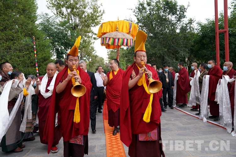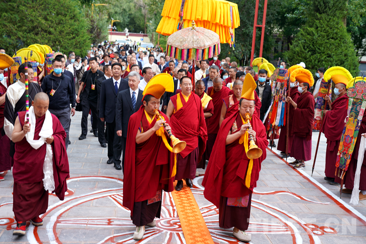 在雪林多吉頗章主殿門前,僧眾提前繪制了金剛結(jié)等吉祥圖案,尺許寬的地毯從歡迎隊(duì)伍處一直延伸到主殿門前。法號(hào)響起,高僧們手持香爐,打著幡幛、華蓋,吹奏佛樂,以藏傳佛教隆重的禮儀迎接班禪的到來。在眾高僧的簇?fù)硐拢喽U向夾道歡迎的僧俗信教群眾頷首微笑、揮手致意。在僧俗信教群眾目光的緊緊追隨中,班禪緩步進(jìn)入雪林多吉頗章主殿。(中國西藏網(wǎng) 記者/王淑 旦增拉姆 歐帆)