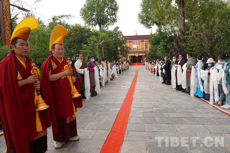隨后,班禪乘車抵達(dá)位于拉薩的班禪行宮雪林多吉頗章。細(xì)雨綿綿的拉薩城,清風(fēng)習(xí)習(xí)涼爽宜人。西藏自治區(qū)黨委常務(wù)副書記、自治區(qū)政協(xié)黨組書記莊嚴(yán)與十九屆中央候補(bǔ)委員,西藏自治區(qū)黨委副書記、拉薩市委書記嚴(yán)金海等西藏自治區(qū)相關(guān)領(lǐng)導(dǎo)在此迎候。拉薩各大寺廟的僧眾代表和信教群眾代表手捧潔白的哈達(dá)在微微細(xì)雨中翹首以盼班禪的到來。