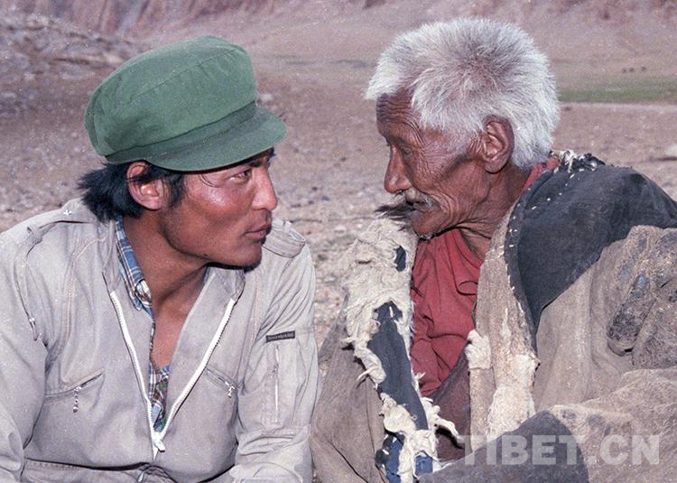 這是次桑老人(右)在與文部辦事處(現(xiàn)尼瑪縣)畜牧局干部邊巴(左)交流(唐召明1987年攝)