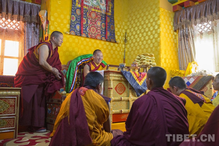 班禪講經(jīng)、禮佛后,在納塘寺主殿二樓一間經(jīng)堂內(nèi)特意現(xiàn)場(chǎng)抽查測(cè)試了年輕僧人對(duì)佛經(jīng)的背誦學(xué)習(xí)情況,聽(tīng)取四批僧人背誦經(jīng)文,并隨機(jī)提問(wèn)。聽(tīng)到僧人們對(duì)答如流,班禪頻頻點(diǎn)頭、微笑肯定。