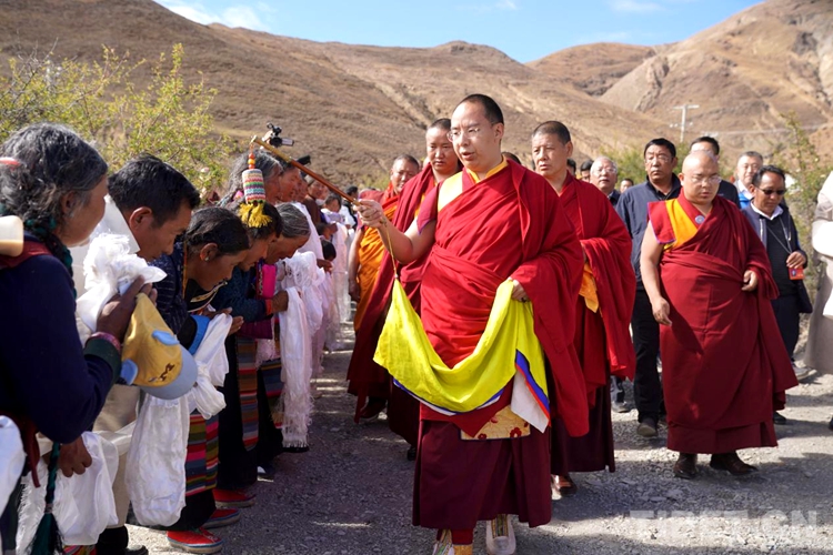 沿途農(nóng)牧區(qū)的信教群眾聞?dòng)嵡皝?lái),身著傳統(tǒng)節(jié)日盛裝、手捧潔白哈達(dá),隊(duì)伍綿延數(shù)里,虔誠(chéng)迎候班禪的到來(lái)。每當(dāng)遇到前來(lái)迎接的信教群眾,班禪便示意車輛緩行,開(kāi)窗向信眾揮手致意,氣度不凡又格外親切。