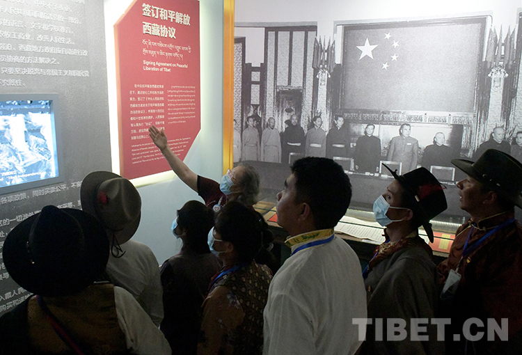 這是森布日那曲極高海拔生態(tài)搬遷安置點(diǎn)的赴京基層干部在西藏文化博物館參觀紀(jì)念西藏和平解放70周年展覽(唐召明2021年10月16日攝)