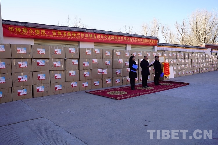 捐贈(zèng)儀式上,雙湖縣副縣長普珍和農(nóng)業(yè)農(nóng)村局局長次仁達(dá)瓦代表雙湖縣縣委、縣政府和廣大基層牧民群眾接受捐贈(zèng)并向班禪表示感謝。